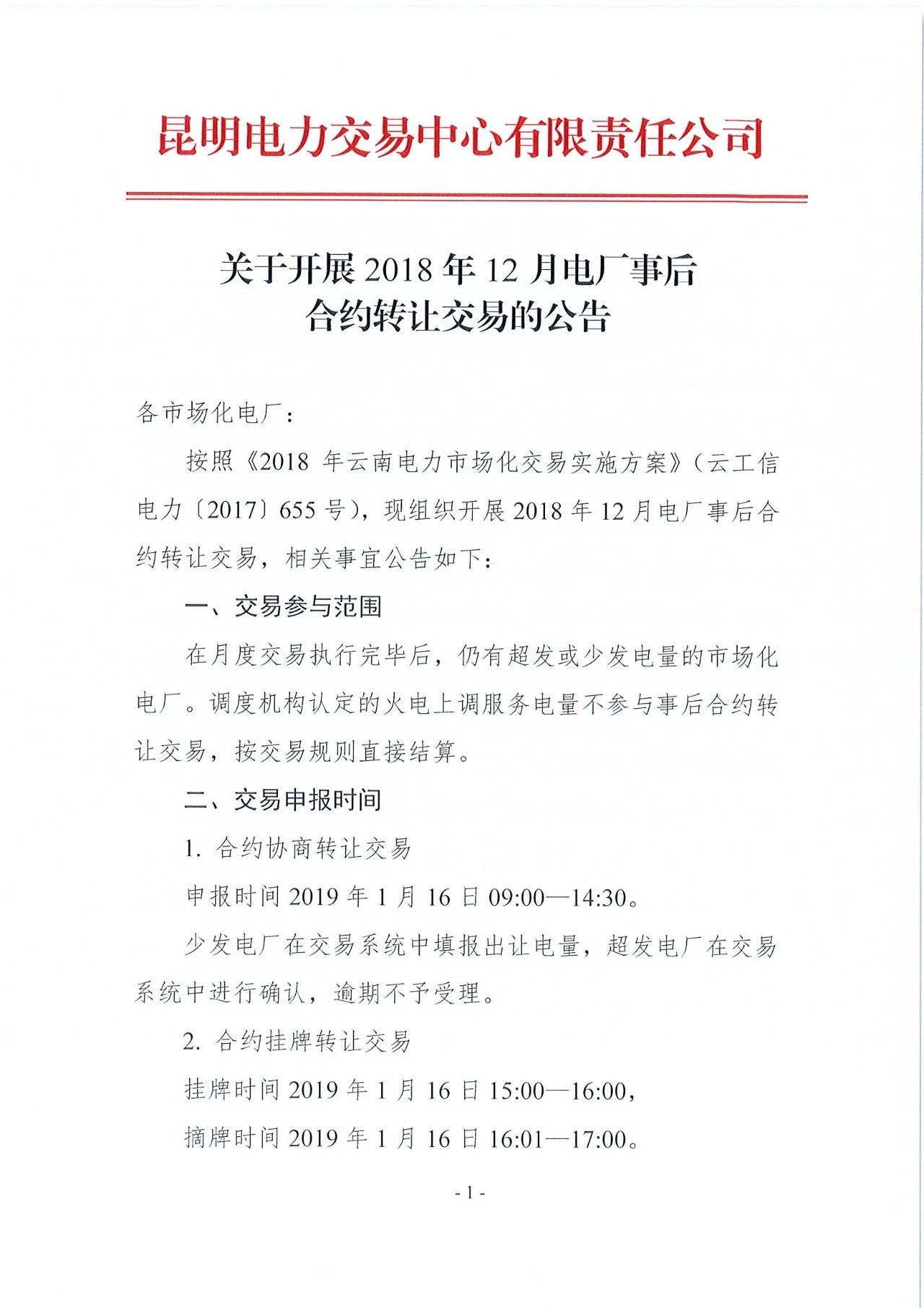 云南2018年12月電廠事后合約轉(zhuǎn)讓交易1月16日展開