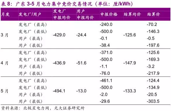 返還比例變化導(dǎo)致發(fā)電企業(yè)報(bào)價(jià)提升。在廣東3-5月的電力集中競(jìng)價(jià)交易中,由于發(fā)電企業(yè)和用戶(hù)之間75%:25%的返還比例,發(fā)電企業(yè)報(bào)價(jià)時(shí)基本按接近-500厘/度電的地板價(jià)報(bào)價(jià)以確保成交,而按照75%的返還系數(shù)最終結(jié)算的價(jià)差基本在-150厘/度電左右,按照邊際成本考慮的話(huà)仍有可觀(guān)收益。6月份開(kāi)始返還比例調(diào)整為50%,若發(fā)電企業(yè)仍報(bào)地板價(jià),則至少讓利250厘/kWh,大部分發(fā)電企業(yè)應(yīng)該無(wú)法接受這一虧本價(jià)。這就迫使發(fā)電企業(yè)放棄地板價(jià),回歸理性報(bào)價(jià)。實(shí)際上,6月集中競(jìng)價(jià)中,報(bào)價(jià)-500厘/kWh的發(fā)電企業(yè)最終結(jié)算價(jià)差為-289.6厘/kWh,廣東煤電上網(wǎng)標(biāo)桿電價(jià)為0.45元/kWh,也就是說(shuō)該發(fā)電企業(yè)此次集中競(jìng)價(jià)電量的最終上網(wǎng)電價(jià)為0.16元/kWh,即使是邊際成本也無(wú)法覆蓋。6月份發(fā)電側(cè)最高申報(bào)價(jià)差為-60.6厘/kWh,平均結(jié)算價(jià)差為-93.6厘/kWh,較前幾月顯著提高,也就意味著售電公司利潤(rùn)的壓縮。