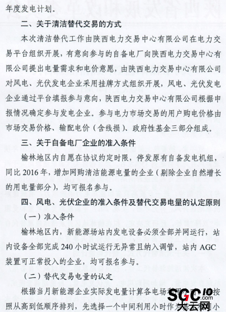 陜西省發(fā)改委日前發(fā)布了《關(guān)于在榆北地區(qū)開(kāi)展清潔能源替代試點(diǎn)工作的函》,文件中指出,在榆林地區(qū)開(kāi)展清潔能源替代自備電廠(chǎng)發(fā)電直接交易試點(diǎn),本次清潔替代電量規(guī)模為8億千瓦時(shí),此部分電量全部視為增量電量,不