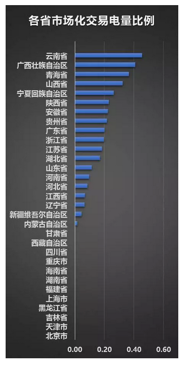 該指標(biāo)顯示該地區(qū)所有市場化交易電量占社會用電量比率的得分。為雙邊協(xié)商交易電量與集中競價交易電量之和。該指標(biāo)得分最高的省份為云南省,將近50%的社會用電量都已經(jīng)可以通過市場化的方式進(jìn)行,為全國最高。交能網(wǎng)為您收集了全國所有地區(qū)的市場化交易比例,統(tǒng)計圖如下: