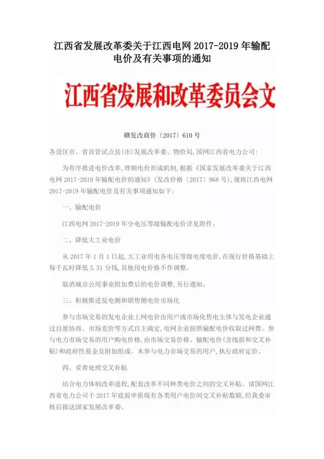 6月15日,江西發(fā)改委發(fā)布了《江西電網(wǎng)2017年-2019年輸配電價及有關事項的通知》。
