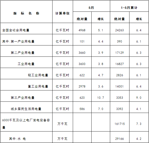 5月份,全社會(huì)用電量4968億千瓦時(shí),同比增長(zhǎng)5.1%,全國(guó)售電量累計(jì)達(dá)19426億千瓦時(shí)。