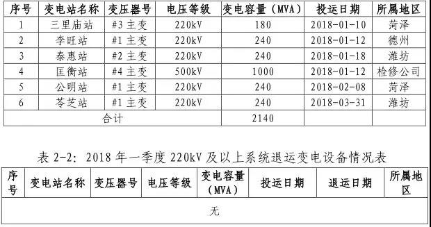 表 2-1: 2018 年一季度 220kV 及以上系統(tǒng)新投產(chǎn)變電設(shè)備情況表