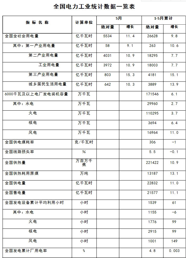 1-5月份全國電力工業(yè)統(tǒng)計數據發(fā)布:全國售電量21577億千瓦時 同比增11.1%