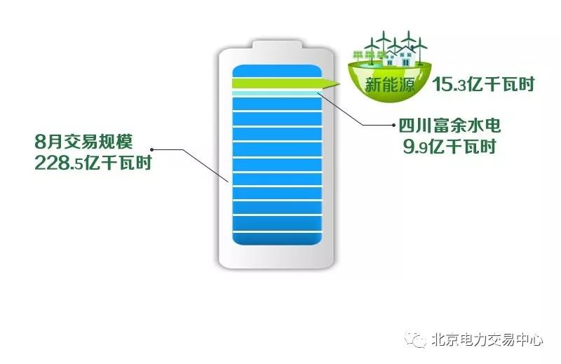 2018年8月,在北京電力交易中心交易平臺(tái)開展市場(chǎng)化交易24筆,交易規(guī)模228.5億千瓦時(shí),其中,新能源15.3億千瓦時(shí)、占比7%,四川富余水電9.9億千瓦時(shí)。