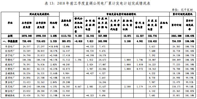 前三季度,直調(diào)公用電廠(chǎng)(不含泰抽電站、興達(dá)熱電、海陽(yáng)核電)實(shí)際完成發(fā)電量 2070.348 億千瓦時(shí),同比增長(zhǎng) 3.60%,完成累計(jì)計(jì)劃的 100.45%,具體情況詳見(jiàn)表 13。