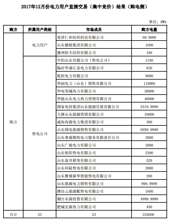 近日,山東電力交易中心發(fā)布了《12月份電力直接交易(集中競價)結(jié)果的公告》,公告稱11月23日組織開展的12月份電力直接交易(集中競價),經(jīng)校核后,確認20家統(tǒng)調(diào)發(fā)電企業(yè)(32臺發(fā)電機組)與3家電力用戶及20家售電公司