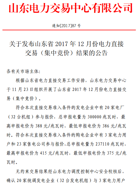 388元/兆瓦時!山東12月份電力直接交易(集中競價)結(jié)果:成交易電量233660兆瓦時
