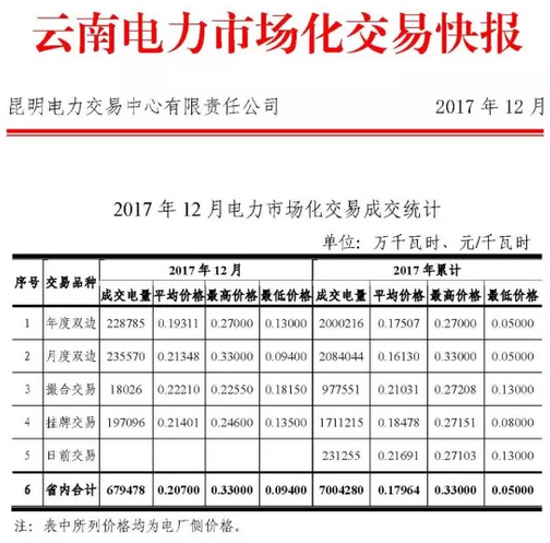 12月4日,昆明電力交易中心發(fā)布了《2017年12月電力市場化交易成交統(tǒng)計》,稱12月年度雙邊成交電量228785萬千瓦時,平均價格0.19311元/千瓦時,最高價格0.27元/千瓦時,最低價格0.13元/千瓦時。