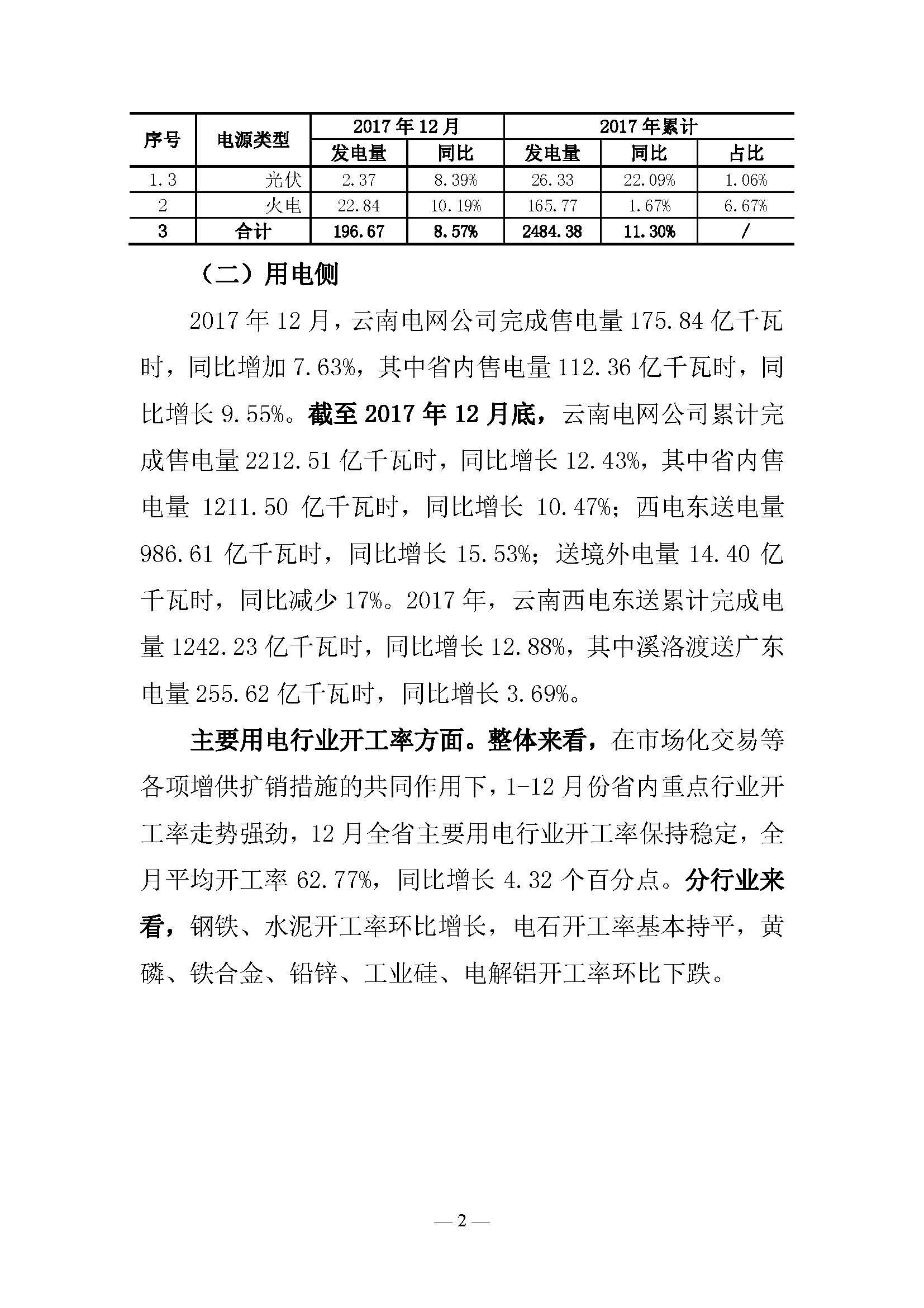 昆明電力交易中心日前發(fā)布了云南電力交易月報(12月)。2017年12月,云南電網(wǎng)公司完成售電量175.84億千瓦時,同比增加7.63%,其中省內(nèi)售電量112.36億千瓦時,同比增長9.55%。截至2017年12月底,云南電網(wǎng)公司累計完成售電量2212.51億千瓦時,同比增長12.43%,其中省內(nèi)售電量1211.5億千瓦時,同比增長10.47%;西電東送電量986.61億千瓦時,同比增長15.53%;送境外電量14.4億千瓦時,同比減少17%。