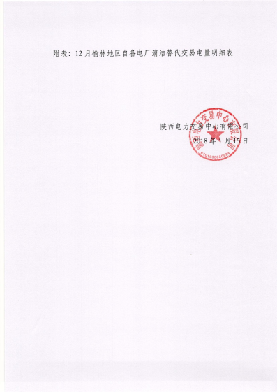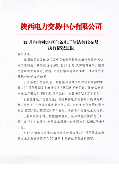 《2017年12月份榆林地區(qū)自備電廠清潔替代交易執(zhí)行情況通報》