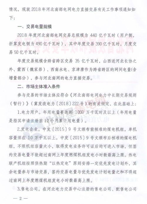 河北省發(fā)改委日前發(fā)布了《關(guān)于開(kāi)展2018年河北南部電網(wǎng)電力直接交易工作的通知》,通知中稱(chēng),2018年度河北南部電網(wǎng)交易總規(guī)模為440億千瓦時(shí)