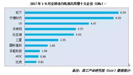 高工產(chǎn)業(yè)研究院(GGII)數(shù)據(jù)顯示,2017年前三季度,寧德時(shí)代的出貨量已經(jīng)躍居全球第二,以6.2GWh的出貨量數(shù)據(jù)上逼近松下的6.54GWh。