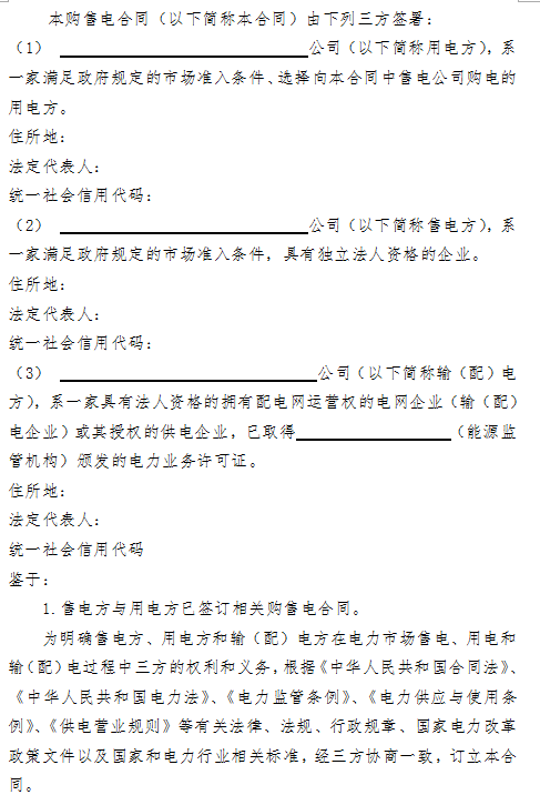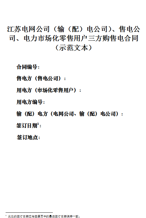 本網(wǎng)獲悉,國家能源局江蘇監(jiān)管辦日前發(fā)布了《售電公司與電力用戶購售電合同(示范文本)》《江蘇電網(wǎng)公司(輸配電公司)、售電公司、電力市場化零售用戶三方購售電合同(示范文本)》。各有關(guān)單位要在開展電力用戶直接