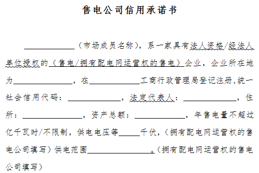 第九條售電公司按固定格式填寫在電力交易平臺網(wǎng)站下載的信用承諾書(詳見附件1),準(zhǔn)確填寫相關(guān)信息,由本單位法人代表簽署并加蓋單位公章,在辦理注冊時提交電力交易中心。