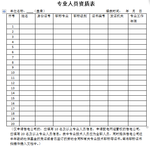 4.專業(yè)人員資質(zhì)表(詳見附件5)、專業(yè)人員身份證復(fù)印件及學(xué)歷證書、職稱證書復(fù)印件。所列專業(yè)技術(shù)人員必須為該售電公司全職人員。