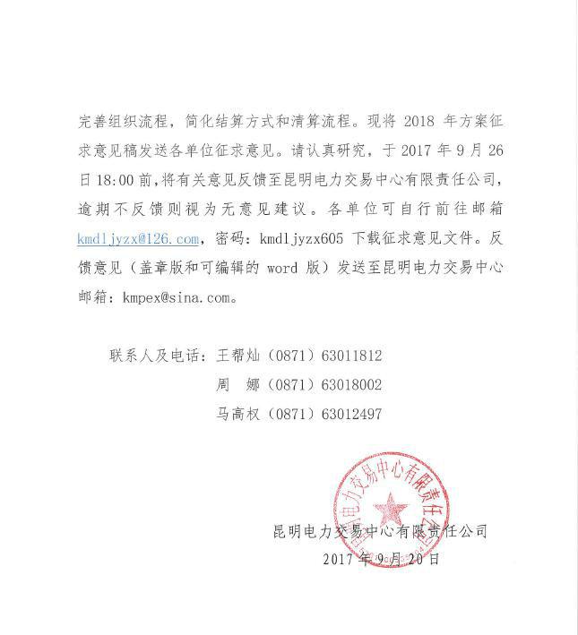 2017年9月20日,昆明電力交易中心發(fā)布征求《2018年云南電力市場化交易實施方案》意見函。2018年方案征求意見稿在保持2017年電力市場化交易方案總體思路和交易模式不變的基礎上,僅在實際操作層面上,優(yōu)化完善組織流程,簡化結算方式和清算流程。各單位請于2017年9月26日18:00前,將有關意見反饋至昆明電力交易中心有限017年9月20日,昆明電力交易中心發(fā)布征求《2018年云南電力市場化交易實施方案》意見函。2018年方案征求意見稿在保持2017年電力市場化交易方案總體思路和交易模式不變的基礎上,僅在實際操作層面上,優(yōu)化完善組織流程,簡化結算方式和清算流程。各單位請于2017年9月26日18:00前,將有關意見反饋至昆明電力交易中心有限責任公司。