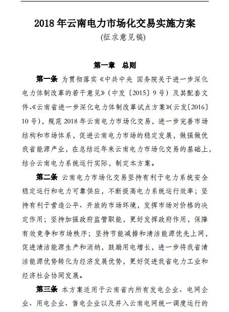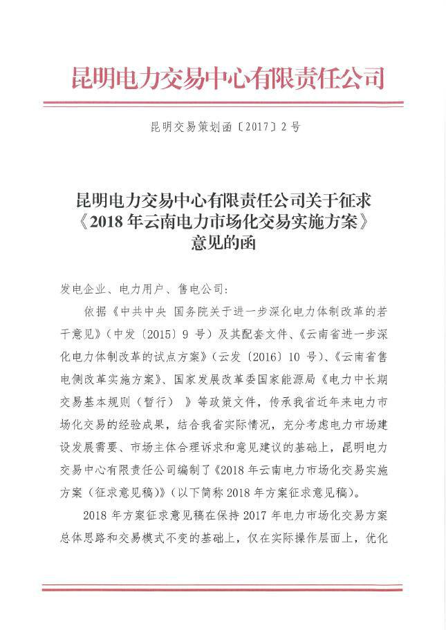 云南開展征求《2018年云南電力市場化交易實施方案》意見工作