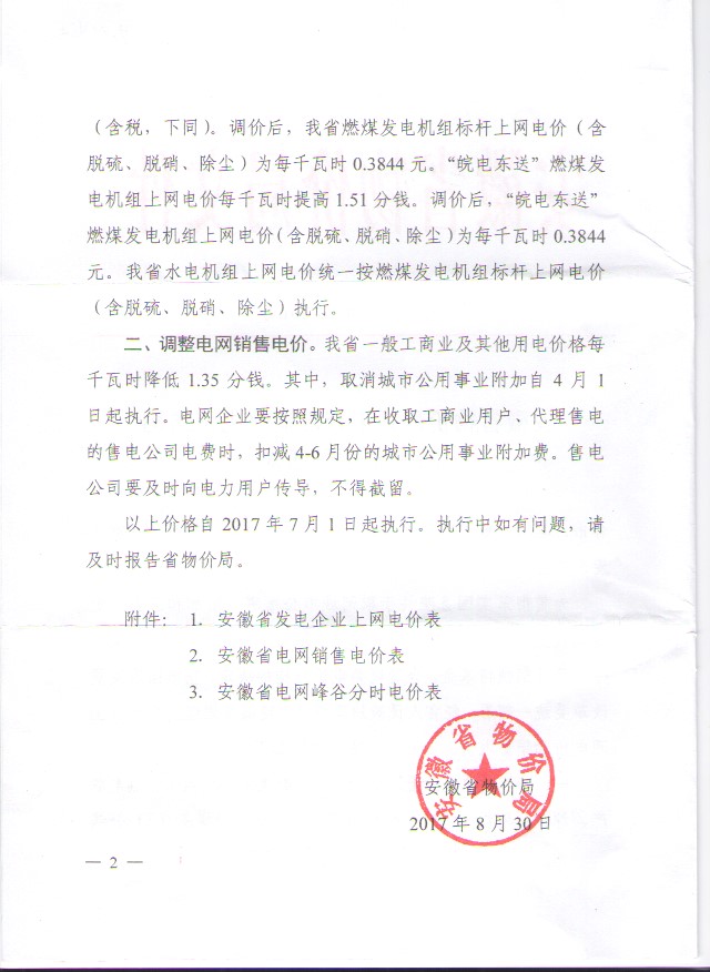 近日安徽省物價局發(fā)布了關(guān)于合理調(diào)整電價結(jié)構(gòu)有關(guān)事項的通知。文件指出,自2017年7月1日起,調(diào)整電網(wǎng)銷售電價:一般工商業(yè)及其他用電價格每千瓦時降低1 35分錢。安徽省燃煤發(fā)電機組(含熱電聯(lián)產(chǎn)、綜合利用發(fā)電機
