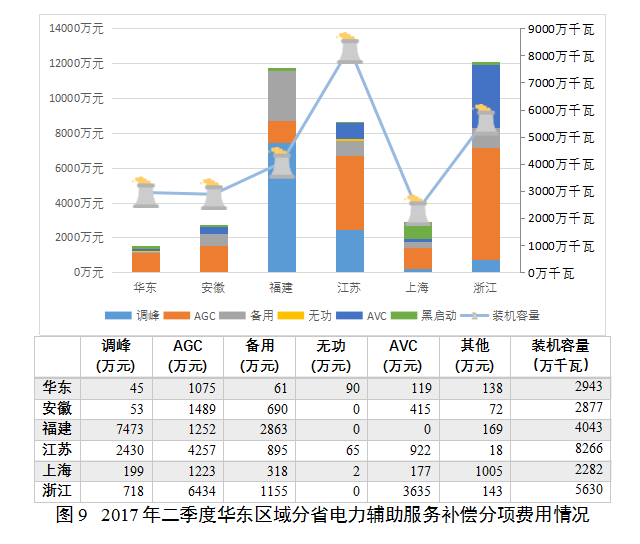 華東區(qū)域由于江浙滬地區(qū)以火電為主的電源結(jié)構(gòu)在消納區(qū)外來(lái)電和可再生能源時(shí)面臨的調(diào)峰壓力,本地備用容量也存在部分富余,電力輔助服務(wù)補(bǔ)償費(fèi)用以調(diào)峰、AGC補(bǔ)償為主,但備用補(bǔ)償占比也較為明顯。