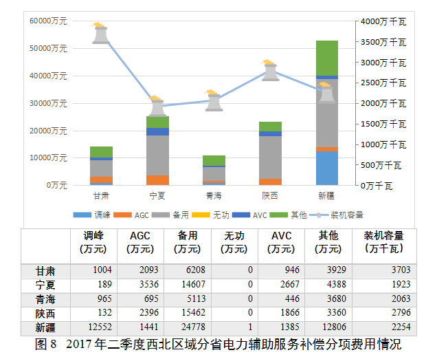 從分項(xiàng)電力輔助服務(wù)補(bǔ)償費(fèi)用來(lái)看,調(diào)峰、AGC和備用補(bǔ)償費(fèi)用占電力輔助服務(wù)補(bǔ)償總費(fèi)用的絕大部分比例,但各區(qū)域的補(bǔ)償費(fèi)用結(jié)構(gòu)也有自身明顯特征。其中,調(diào)峰補(bǔ)償力度以西北、東北最高,AGC補(bǔ)償力度以西北、華北最高,備用補(bǔ)償力度以西北、南方最高。總體來(lái)看,西北區(qū)域的輔助服務(wù)補(bǔ)償力度最大(見圖3)。