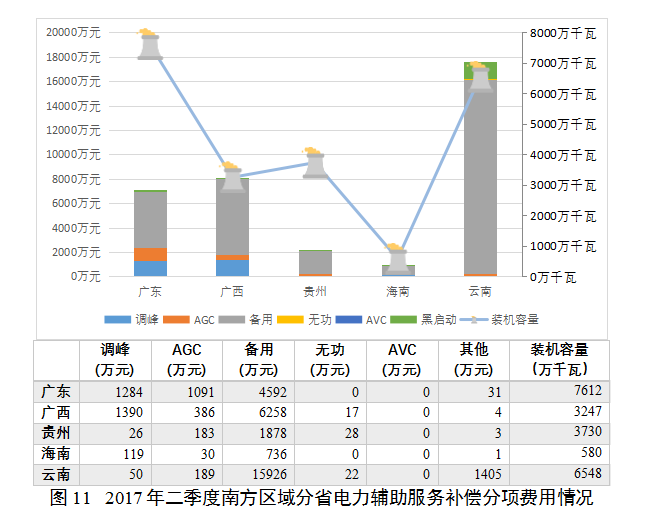 南方區(qū)域除廣東、廣西以AVC補(bǔ)償為主外,其他省份尤其是云南省,由于水電裝機(jī)規(guī)模較大,以備用補(bǔ)償為主??傮w來(lái)看,南方區(qū)域裝機(jī)容量與補(bǔ)償費(fèi)用的總體趨勢(shì)相近,補(bǔ)償力度在各省(區(qū))基本一致(見圖11)。