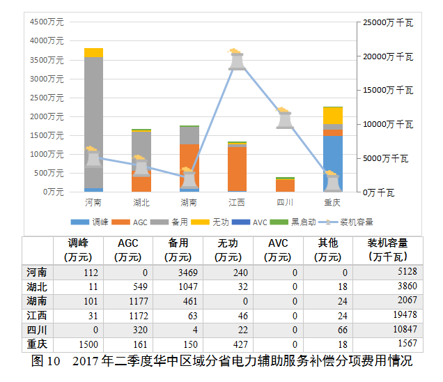 華中區(qū)域的河南、湖北以備用補(bǔ)償為主,重慶以調(diào)峰為主,其他省市以AGC補(bǔ)償為主。河南受負(fù)荷增長(zhǎng)放緩、煤價(jià)走高,以及外來(lái)電等多方面的影響,采取了機(jī)組輪停冷備的方式實(shí)現(xiàn)調(diào)峰,體現(xiàn)在備用補(bǔ)償費(fèi)中。重慶負(fù)荷峰谷差明顯,又作為四川水電的落地點(diǎn)之一,本地電源調(diào)峰壓力較大,補(bǔ)償力度也明顯高于區(qū)域內(nèi)其他省份(見圖10)。