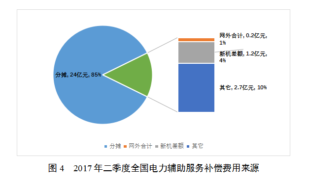 各區(qū)域電力輔助服務(wù)補(bǔ)償費(fèi)用主要來(lái)源于機(jī)組分?jǐn)傎M(fèi)用,在其他費(fèi)用來(lái)源上略有差異。華東區(qū)域一部分費(fèi)用來(lái)自網(wǎng)外跨區(qū)水電分?jǐn)偮涞厥》莸妮o助服務(wù)費(fèi)用。東北區(qū)域網(wǎng)外分?jǐn)偤途W(wǎng)外收取的費(fèi)用在各省之間互抵。西北、華東和東北區(qū)域因沒有新機(jī)并網(wǎng),故2017年二季度無(wú)新機(jī)差額款項(xiàng)。