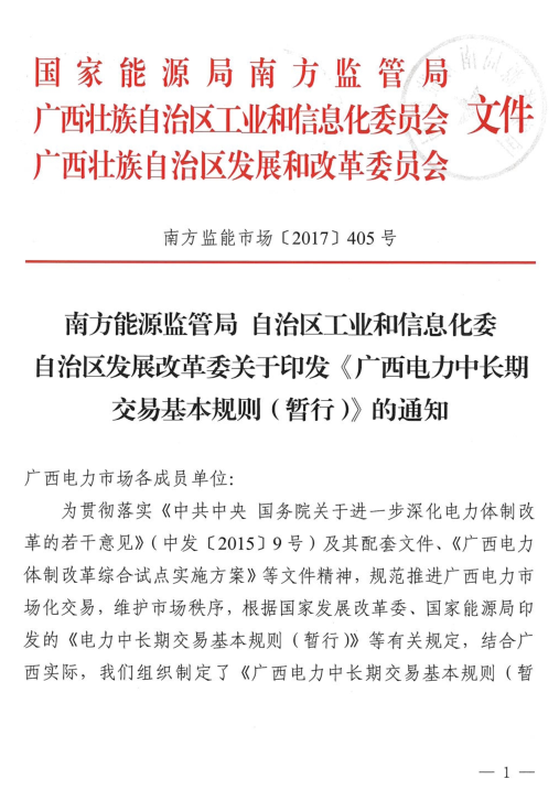 南方能源監(jiān)管局、廣西自治區(qū)工業(yè)和信息化委、廣西自治區(qū)發(fā)改委12月1日聯(lián)合印發(fā)了《廣西電力中長(zhǎng)期交易基本規(guī)則(暫行)》。