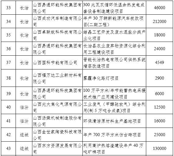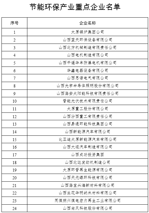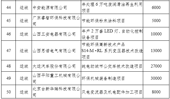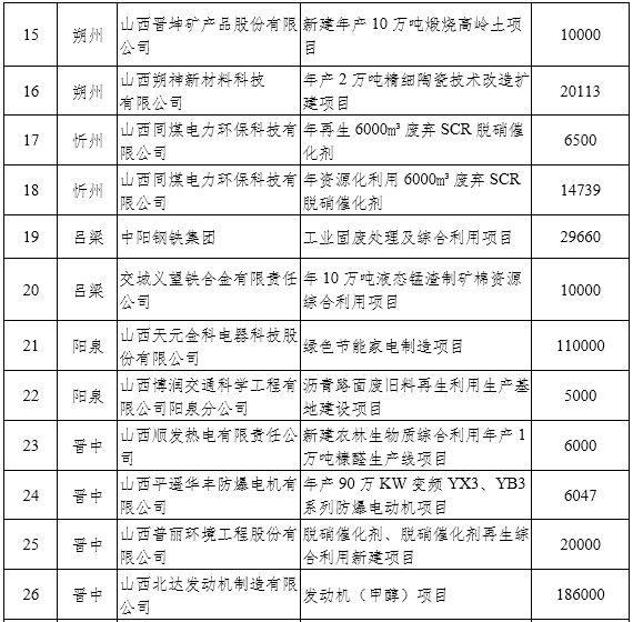 在節(jié)能環(huán)保裝備制造方面,重點(diǎn)推進(jìn)太原重工新能源裝備有限公司風(fēng)力發(fā)電機(jī)組關(guān)鍵零部件智能工廠建設(shè)項(xiàng)目、原鍋爐集團(tuán)有限公司循環(huán)流化床鍋爐超低排放技術(shù)改造、山西平遙華豐防爆電機(jī)有限公司YB3節(jié)能高效電機(jī)二期項(xiàng)目、山西思諾電氣有限公司節(jié)能環(huán)保高新技術(shù)產(chǎn)品S14-M˙RL系列變壓器技術(shù)改造等項(xiàng)目;在節(jié)能技術(shù)推廣方面,重點(diǎn)推進(jìn)山西易通環(huán)能科技集團(tuán)有限公司100萬平方米/年節(jié)能蓄熱電采暖技術(shù)推廣應(yīng)用建設(shè)等項(xiàng)目;在環(huán)保產(chǎn)業(yè)方面,重點(diǎn)推進(jìn)山西福萬達(dá)工業(yè)新材料有限公司霧霾凈化路燈、山西普麗環(huán)境工程股份有限公司脫硝催化劑、脫硝催化劑再生綜合利用等項(xiàng)目;在資源綜合利用方面,重點(diǎn)推進(jìn)山西平朔煤矸石發(fā)電有限責(zé)任公司基于CFB固硫灰升級(jí)利用的年產(chǎn)100萬噸陶粒制備工藝等項(xiàng)目;在節(jié)能環(huán)保服務(wù)方面,重點(diǎn)推進(jìn)同煤電力環(huán)??萍加邢薰灸曩Y源化利用6000m3廢棄SCR脫硝催化劑、山西國科節(jié)能有限公司晉能長治熱電有限公司供熱系統(tǒng)增容改造等項(xiàng)目。(3月底前啟動(dòng)項(xiàng)目申報(bào)工作,按照委內(nèi)要求在年內(nèi)完成相關(guān)工作。)