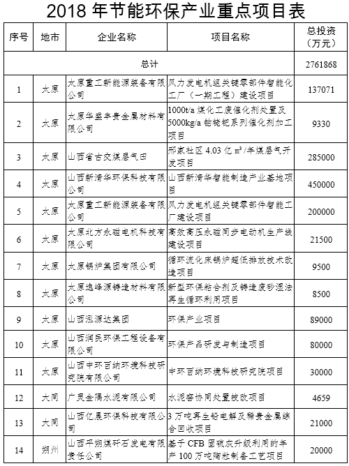 《山西省節(jié)能環(huán)保產(chǎn)業(yè)2018年行動(dòng)計(jì)劃》附環(huán)保產(chǎn)業(yè)重點(diǎn)項(xiàng)目表