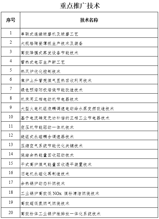 著力攻克節(jié)煤節(jié)電、余熱余壓利用、大氣污染防治、固體廢物處置和資源化利用、礦山治理與土壤修復(fù)等方面的關(guān)鍵共性技術(shù);推進(jìn)落實(shí)國家重點(diǎn)節(jié)能低碳技術(shù)推廣目錄,圍繞煤炭、電力、冶金、化工、焦化、建材等工業(yè)重點(diǎn)領(lǐng)域,出臺(tái)山西省重點(diǎn)節(jié)能技術(shù)推廣目錄。重點(diǎn)推廣串聯(lián)式連續(xù)球磨機(jī)及球磨工藝、大規(guī)格陶瓷薄板生產(chǎn)技術(shù)及裝備、高效降膜式蒸發(fā)設(shè)備節(jié)能技術(shù)、蓄熱式電石生產(chǎn)新工藝、熱風(fēng)爐優(yōu)化控制技術(shù)、焦?fàn)t上升管荒煤氣顯熱回收利用技術(shù)、機(jī)床用三相電動(dòng)機(jī)節(jié)電器技術(shù)、空壓機(jī)節(jié)能驅(qū)動(dòng)一體機(jī)技術(shù)、燒結(jié)余熱能量回收驅(qū)動(dòng)技術(shù)、干式高爐煤氣能量回收透平裝置技術(shù)、余熱鍋爐動(dòng)態(tài)補(bǔ)燃技術(shù)等20項(xiàng)技術(shù)。(6月底前,組織申報(bào)我省先進(jìn)適用節(jié)能技術(shù),12月底前出臺(tái)山西省重點(diǎn)節(jié)能技術(shù)推廣目錄。)