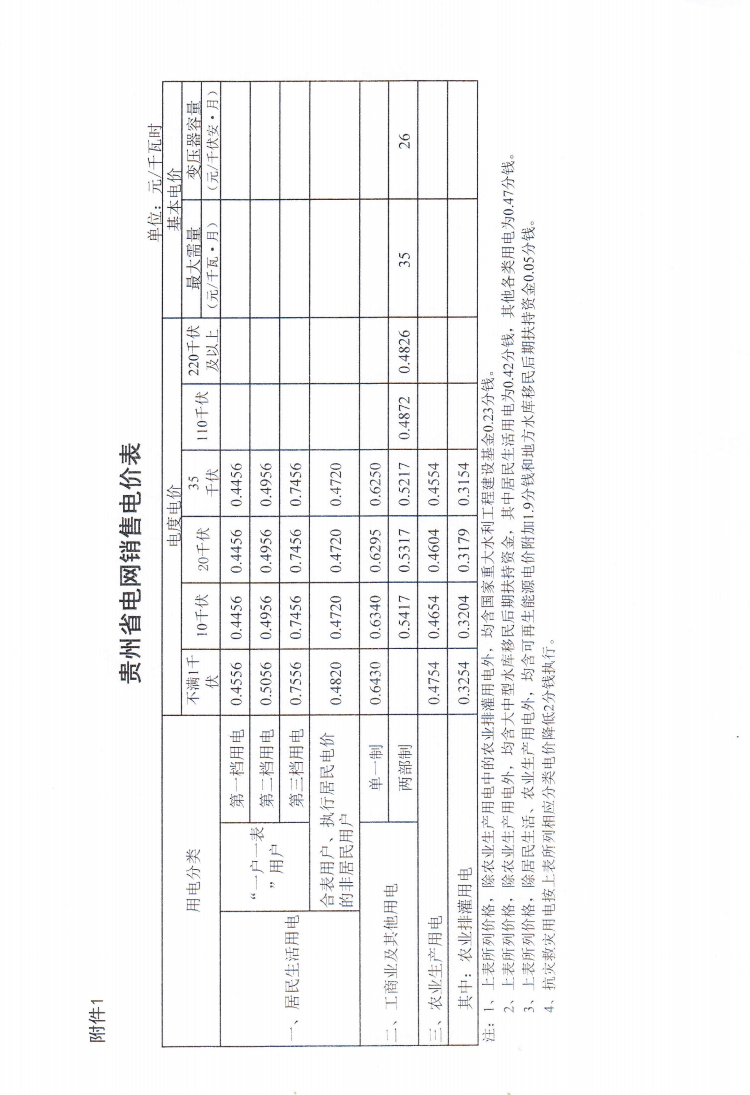 降低貴州省一般工商業(yè)目錄銷(xiāo)售電價(jià)平均每千瓦時(shí)4 46分錢(qián)。其中不滿1千伏降低每千瓦時(shí)4 53分錢(qián),10千伏降低4 43分錢(qián),20千伏降低4 38分錢(qián),35千伏降低4 33分錢(qián)。