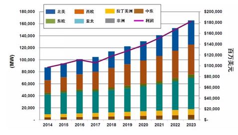 根據(jù)Navigant Research的研究,全球分布式電源容量2023年將達(dá)到16550萬千瓦。其中,北美、西歐和亞太地區(qū)將是領(lǐng)頭軍,尤其是亞太地區(qū),占比達(dá)到32%(5230萬千瓦)。