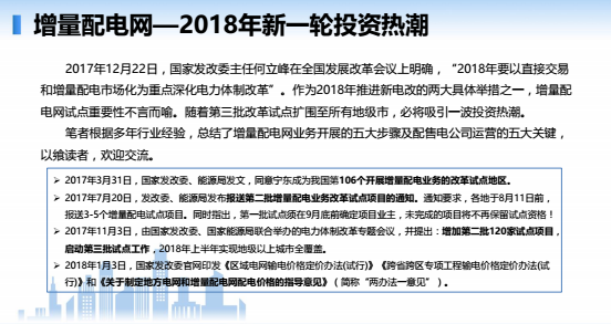 作為2018年推進(jìn)新電改的兩大具體舉措之一,增量配電網(wǎng)試點(diǎn)重要性不言而喻,隨著第三批改革試點(diǎn)擴(kuò)圍至所有地級(jí)市,必將吸引一波投資熱潮,筆