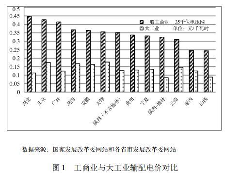 由于銷售電價(jià)本質(zhì)上是由發(fā)電價(jià)、輸電價(jià)、配電價(jià)、銷售費(fèi)用及其他稅費(fèi)構(gòu)成的。而發(fā)電端和銷售端定價(jià)市場(chǎng)化程度較高,發(fā)生的交叉補(bǔ)貼較少,因此,我國電價(jià)體系中的交叉補(bǔ)貼主要體現(xiàn)在輸配電價(jià)上。以目前我國已公布的35kV省級(jí)電網(wǎng)輸配電價(jià)為例(見圖1),可看到大工業(yè)輸配電價(jià)平均比一般工商業(yè)低61%,而一些高耗能大工業(yè)的輸配電價(jià)甚至更低,因此二者間可能存在交叉補(bǔ)貼。更顯著的應(yīng)當(dāng)是發(fā)生在居民、農(nóng)業(yè)用戶與工業(yè)、工商業(yè)用戶之間的交叉補(bǔ)貼。雖然目前沒有對(duì)居民和農(nóng)業(yè)用戶單獨(dú)測(cè)算輸配電價(jià),但從其銷售電價(jià)可看出隱含輸配電價(jià)低于實(shí)際成本。