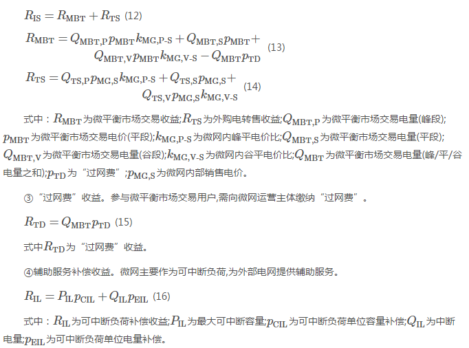 ②內(nèi)部售電收益。分為微平衡市場交易收益和外購電轉(zhuǎn)售收益兩部分。分布式能源通過微平衡市場交易,實現(xiàn)就近消納,售電價格為微平衡市場交易價格。微網(wǎng)運營主體將外部電力市場購買電量轉(zhuǎn)售給微網(wǎng)用戶,售電價格為雙方自主協(xié)商價格。同時微網(wǎng)運營主體在微網(wǎng)內(nèi)部自主確定峰/谷/平電價比等電價參數(shù),開展精細化需求側(cè)響應。