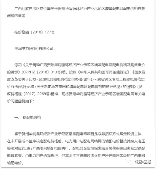 下圖是廣西自治區(qū)物價局針對賀州華潤循環(huán)經(jīng)濟(jì)產(chǎn)業(yè)示范園區(qū)增量配電網(wǎng)配電價格核定的一個函。其中提到:“配電企業(yè)可探索結(jié)合負(fù)荷率等因素制定輸配電價套餐,由電力用戶選擇執(zhí)行,但其水平不得超過該類用戶所在電壓等級的廣西電網(wǎng)收費(fèi)電價”。