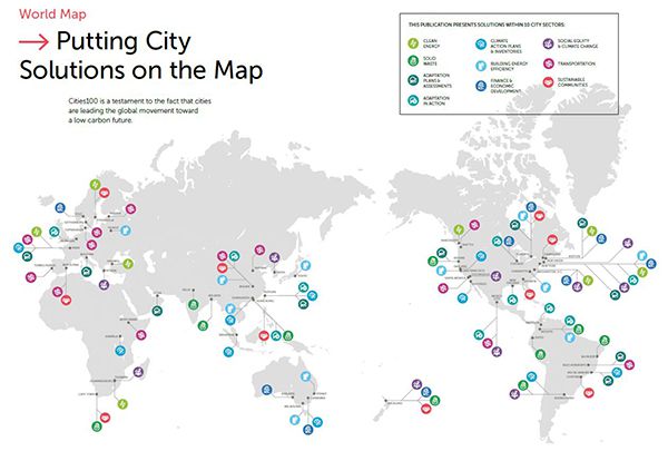 100城項目分布圖。本文圖片除特殊標注外均來自:100 solutions for climate action in cities
