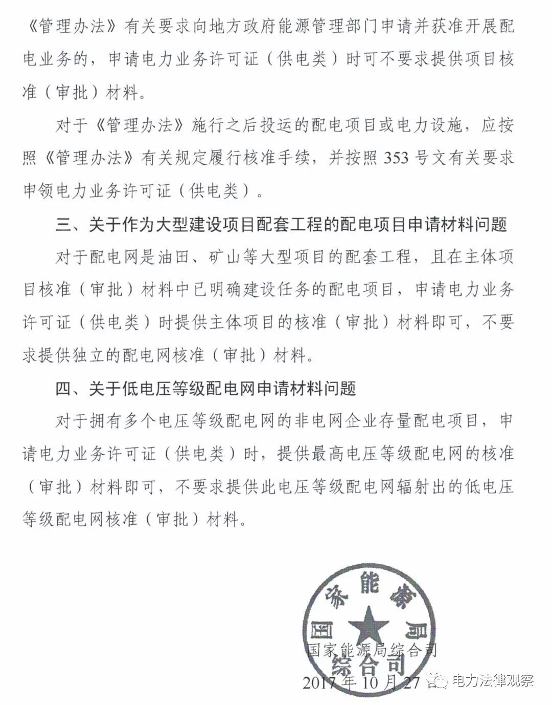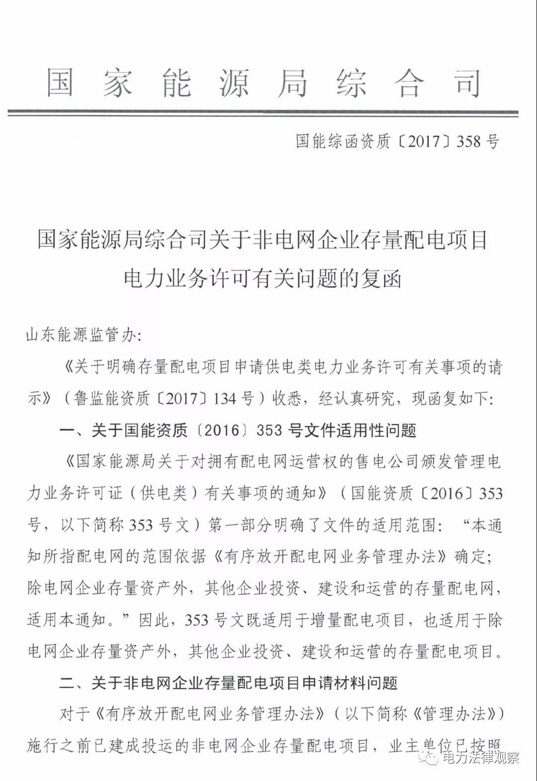 近日,國家能源局綜合司做出《關于非電網企業(yè)存量配電項目電力業(yè)務許可有關問題的復函》(國能綜函資質[2017]358)。觀茶君閱讀《復函》之后發(fā)現(xiàn),該《復函》給非電網企業(yè)存量配電項目業(yè)務許可證的辦理帶來一系列利好消息: