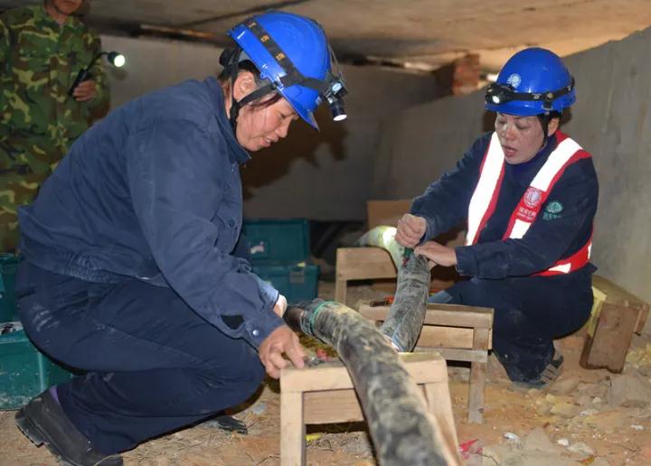 洪燕和吳美劍在成功大橋橋面下的狹窄空間里制作電纜接頭。(馮敏)