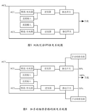 (4)當(dāng)兩臺UPS因故退出運行時,負(fù)載才轉(zhuǎn)由靜態(tài)旁路電源供電,逆變器轉(zhuǎn)旁路的時間小于0.5ms,對負(fù)載基本無擾動。