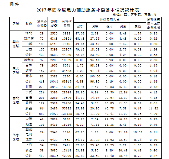附件:2017年四季度電力輔助服務補償基本情況表