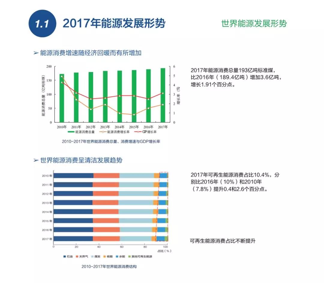 世界能源目前呈清潔化發(fā)展趨勢(shì),到2017年,全球可再生資能源消費(fèi)占比已經(jīng)達(dá)到10.4%,中國(guó)的可再生能源消費(fèi)占比達(dá)到11.7%,高于全球可再生能源發(fā)展的水平。(點(diǎn)擊圖片可查看大圖,下同)