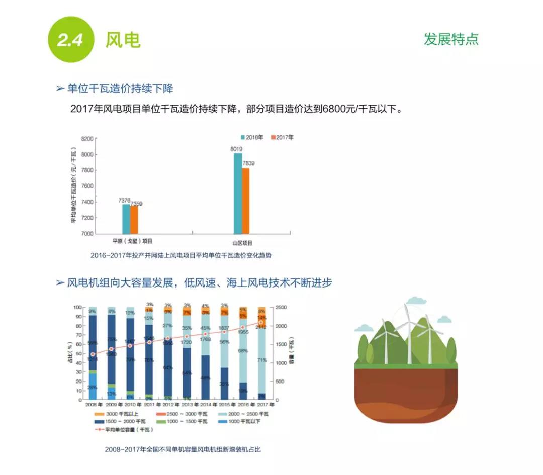 風(fēng)電方面,去年我國(guó)核準(zhǔn)的陸上風(fēng)電和海上風(fēng)電達(dá)4958萬千瓦,2017年投產(chǎn)風(fēng)電達(dá)到了1503萬千瓦,累計(jì)并網(wǎng)裝機(jī)容量1.64億千瓦。棄風(fēng)現(xiàn)象得到了有效控制,風(fēng)電單位千瓦造價(jià)持續(xù)下降,2017年部分項(xiàng)目的造價(jià)已經(jīng)低于每千瓦6800元。