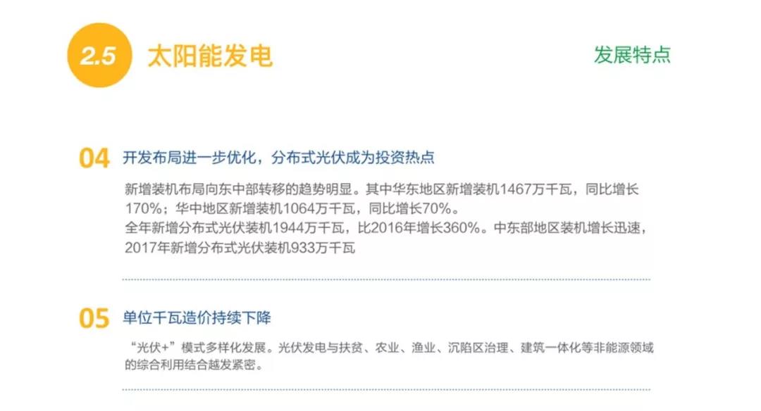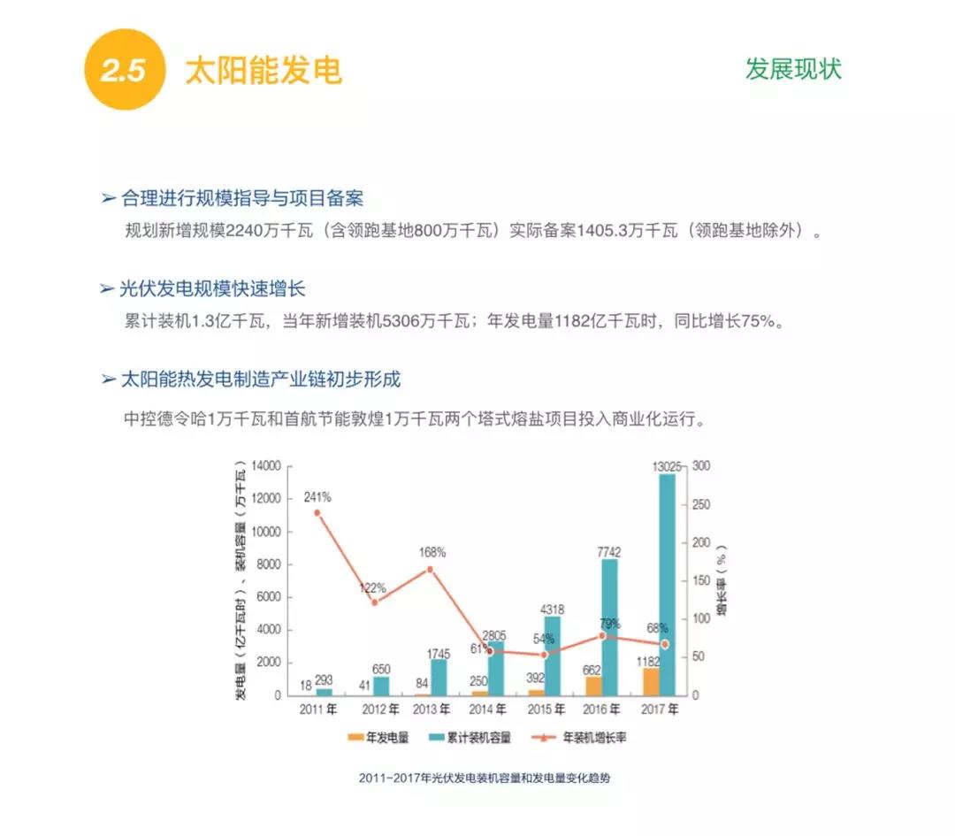 在太陽能發(fā)電方面,去年我國(guó)新增裝機(jī)5306萬千瓦,目前我國(guó)光伏發(fā)電累計(jì)裝機(jī)已達(dá)1.3億千瓦。同時(shí),我國(guó)太陽能熱發(fā)電制造產(chǎn)業(yè)鏈也初步形成。2017年太陽光伏發(fā)電投資規(guī)??焖僭鲩L(zhǎng),比2016年增長(zhǎng)了41%,同時(shí)單位千瓦造價(jià)部分已經(jīng)降低至每千瓦5500元以下,棄光的現(xiàn)象也得到了有效控制。