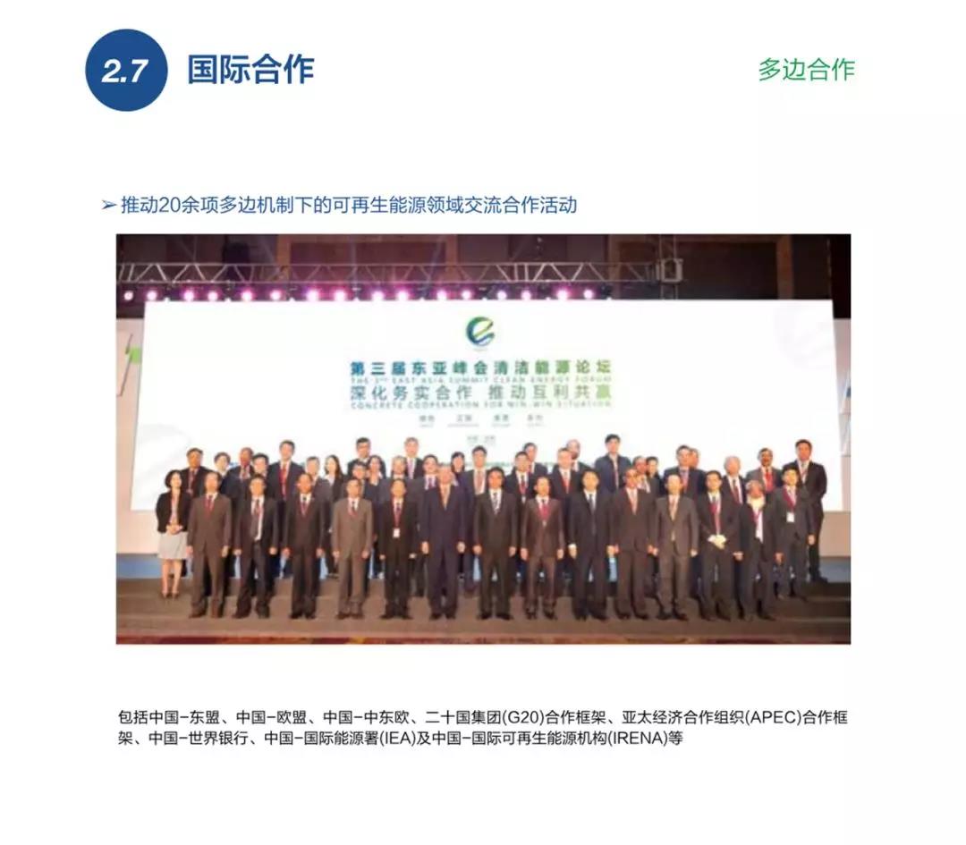 國(guó)際合作方面,去年國(guó)家能源局推動(dòng)了20余項(xiàng)多邊機(jī)制下可再生能源的領(lǐng)域交流互動(dòng),同時(shí)與40多個(gè)國(guó)家和地方政府簽署涵蓋可再生能源技術(shù)、能源效率、智能電網(wǎng)、電源開發(fā)等方面的雙邊合作協(xié)議。