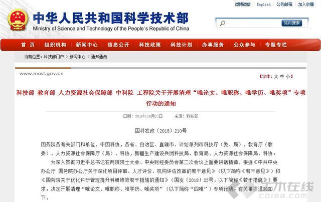 10月23日,科技部、教育部、人力資源社會保障部、中科院和中國工程院聯(lián)合發(fā)布通知,開展清理“唯論文、唯職稱、唯學(xué)歷、唯獎項”(以下簡稱“四唯”)專項行動。