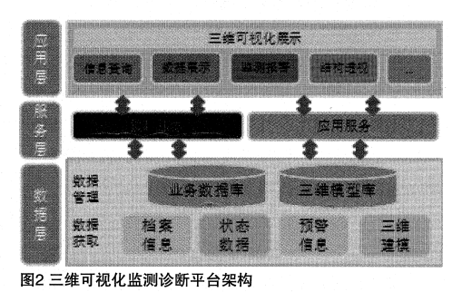 基于三維可視化的GIS局放在線監(jiān)測診斷平臺采用開放式可擴(kuò)展的架構(gòu)設(shè)計(jì),系統(tǒng)架構(gòu)按照數(shù)據(jù)層、服務(wù)層、應(yīng)用層三層基本架構(gòu)設(shè)計(jì),如圖2所示。