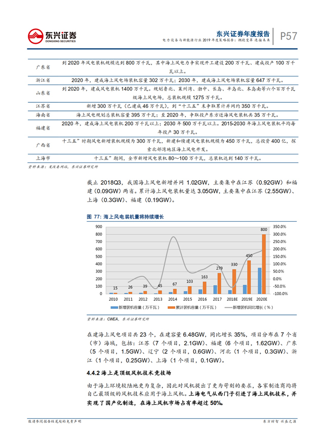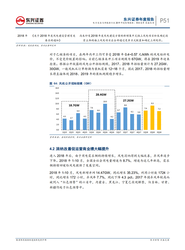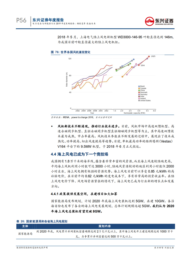 風(fēng)電行業(yè)在陸上風(fēng)資源越來越稀缺的背景下,發(fā)展重心開始往海上轉(zhuǎn)移,海上風(fēng)電大型風(fēng)機將是主要發(fā)展方向。2019年風(fēng)電將進入競價配置時代,平價上網(wǎng)進度被進一步加快,發(fā)電量消納將成為影響風(fēng)電行業(yè)的重要因素。